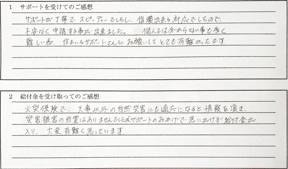 通常のサポートは、創業時から弁護士監修のもと法律法令に則ったサービスを提供しており、これまで法的に保険会社・行政・お客様とのトラブルは1度もございませんが、法律の関係で弊社がお客様の代わりに代理申請等は出来ませんので、保険会社への請求や窓口はお客様となります。